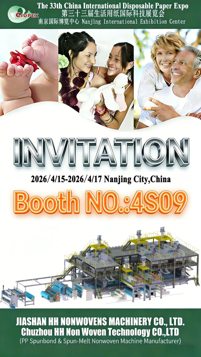 JIASHAN HH Nonwovens Machinery CO., LTD. en Chuzhou HH Non Woven Technology CO., LTD kondigen met trots onze deelname aan de 33e China Internationale Expo voor Wegwerppapier (CIDPEX 2026) , vindt plaats van 15 tot 17 april 2026 , in het Nanjing International Exhibition Center, Nanjing-stad, China.